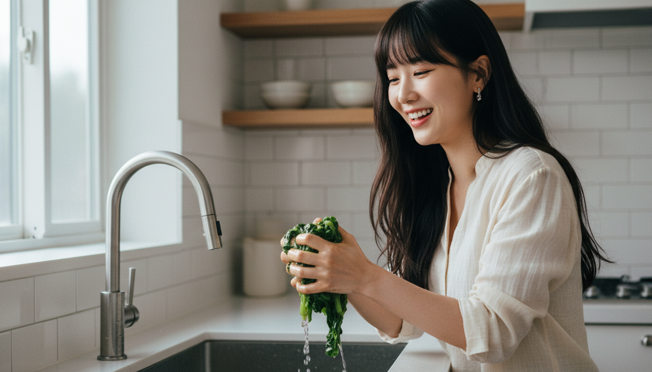 데친 후 처리 즉시 찬물에 헹굼 색과 식감 모두 유지됨